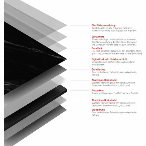 – 2x Aluminium-Deckschichten, 0,3 mm und ein Kern aus Polyethylen Typ LDPE