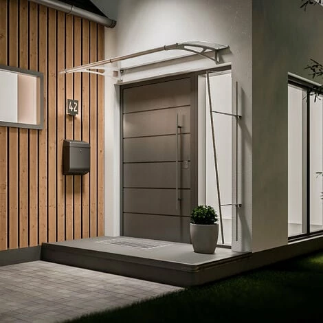 Das Vordach besteht aus einer 4mm starken Acrylglas Abdeckung und Wandhalterungen aus matt gebürstetem Edelstahl. Das spricht für eine lange Lebensdauer. Die Acrylglas Abdeckung ist – ebenso wie die Edelstahlwandhalterung – beständig gegen Witterung und UV-Strahlung. Das Vordach ist stabil und trotzdem leicht.